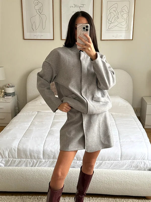 Estrené este conjunto gris y me encantó su caída limpia y el diseño minimalista. La chaqueta tiene un corte amplio muy cómodo y la falda mantiene una silueta sofisticada sin perder movilidad.